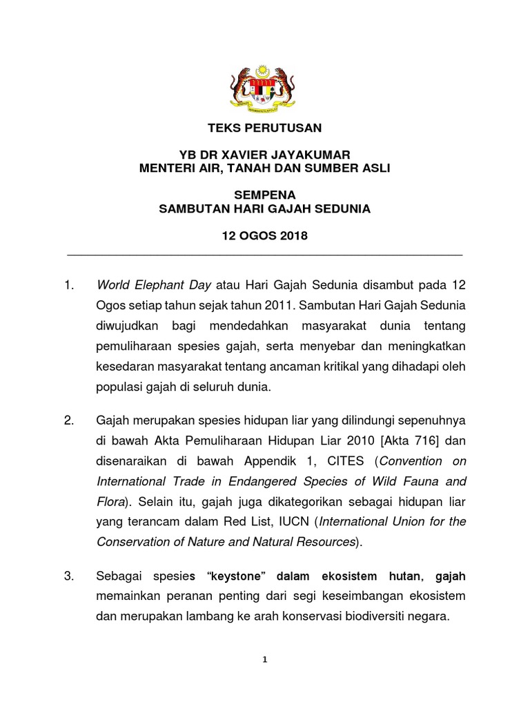 Teks Perutusan Yb Dr Xavier Jayakumar Menteri Air Tanah Dan Sumber Asli Sempena Sambutan Hari Gajah Sedunia 12 Ogos 2018
