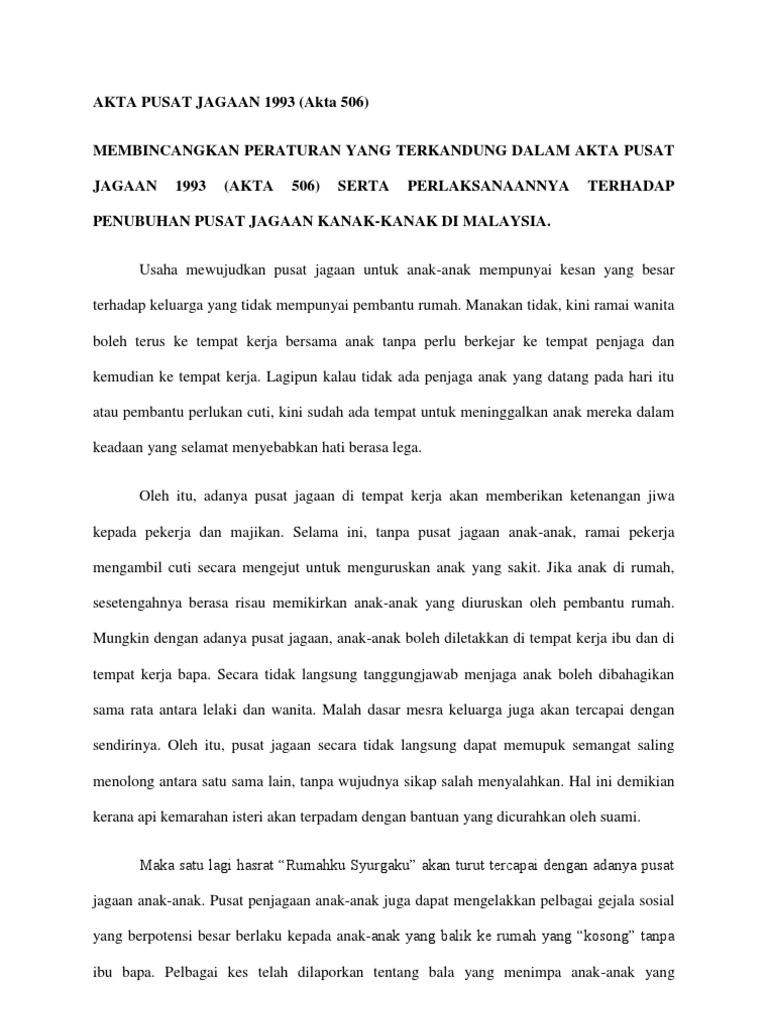 T afsiran 3. 1995 majlis ketua pustakawan universiti awam mkp ua councl of chief librarian public university. Semenanjung malaysia 1 jun 1994 p u. Akta pusat jagaan 1993 akta 506 akta pusat jagaan 1993 akta 506 digubal bertujuan untuk mengadakan peruntukan bagi pendaftaran pemeriksaan dan penguatkuasaan ke atas pusat jagaan dan bagi perkara yang berkaitan dengannya demi menentukan kebajikan kesejahteraan dan keselamatan penghuni diutamakan.