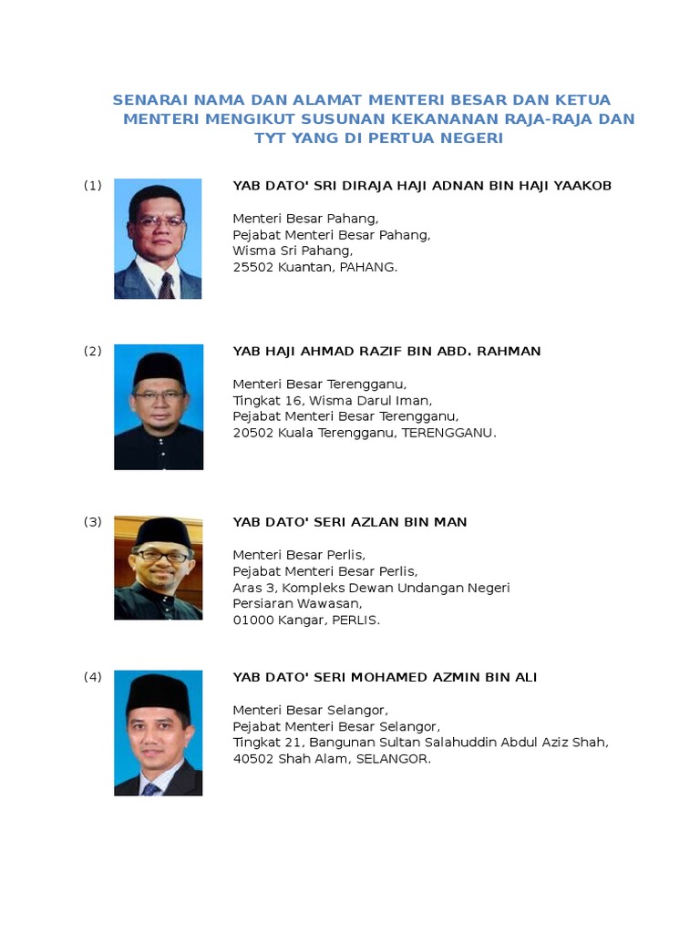 Senarai Nama Alamat Menteri Besar Dan Ketua Menteri Mengikut Susunan Kekananan Raja Raja Dan Tyt Yang Dipertua Negeri
