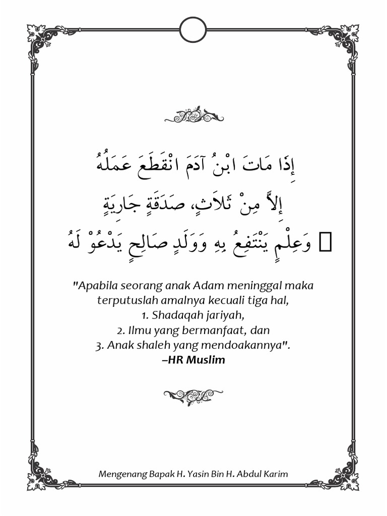 Rasulullah Saw Bersabda Apabila Anak Adam Meninggal Dunia Maka Terputuslah Amalnya Kecuali Tiga Perkara Yaitu Sedekah Jariyah Ilmu Yang Bermanfaat Dan Anak Shaleh Yang Mendoakan Kedua Orang Tuanya Hr At Tirmidzi