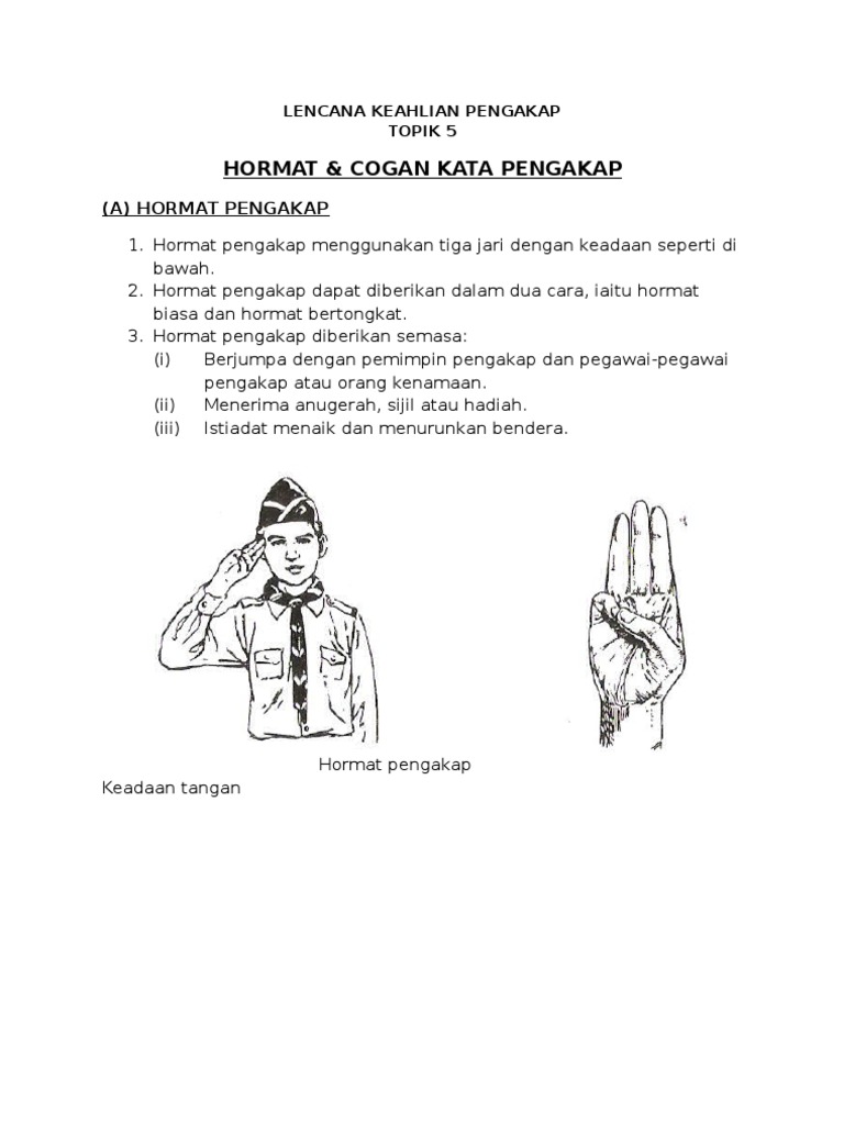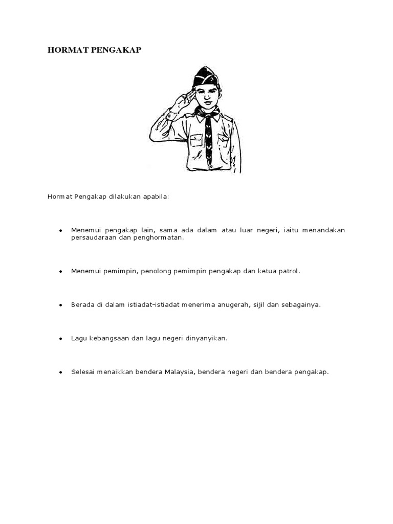 Kaedah memberi hormat salam penghormatan kepada ketua kepada bendera yang dinaikkan kaedah member persetiaankepada lagu kebangsaan. Ringkasan tahun negeri yang menubuhkan pergerakan pengakap 1910 singapura f c. Cogan kata bagi unit unit tersebut. Hormat isyarat dan salam pengakap.