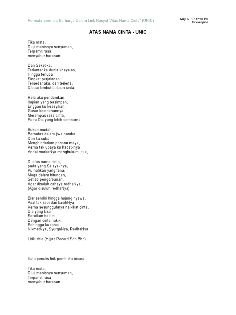 Perrmata Berharga Dalam Lirik Nasyid Atas Nama Cinta Unic