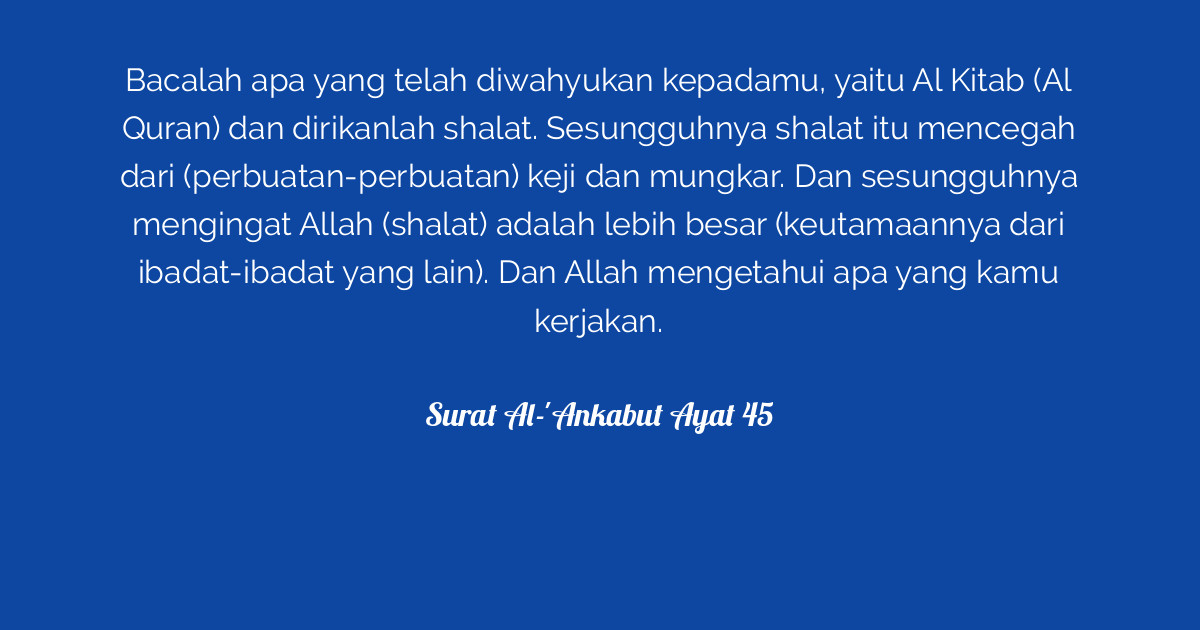 Ayat quran tentang shalat. Sesungguhnya shalat itu mencegah dari perbuatan perbuatan keji dan mungkar. Ayat tentang perintah sholat kita tentunya sudah sepakat bahwa sholat yang 5 waktu adalah kewajiban bagi setiap umat islam. Dan allah mengetahui apa yang kamu kerjakan. Dan dirikanlah shalat tunaikanlah zakat dan ruku lah beserta orang orang yang ruku.