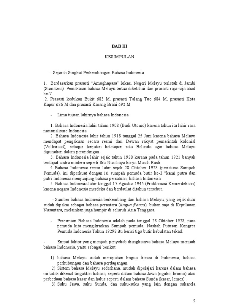 Bab Iii Kesimpulan Sejarah Singkat Perkembangan Bahasa Indonesia 1