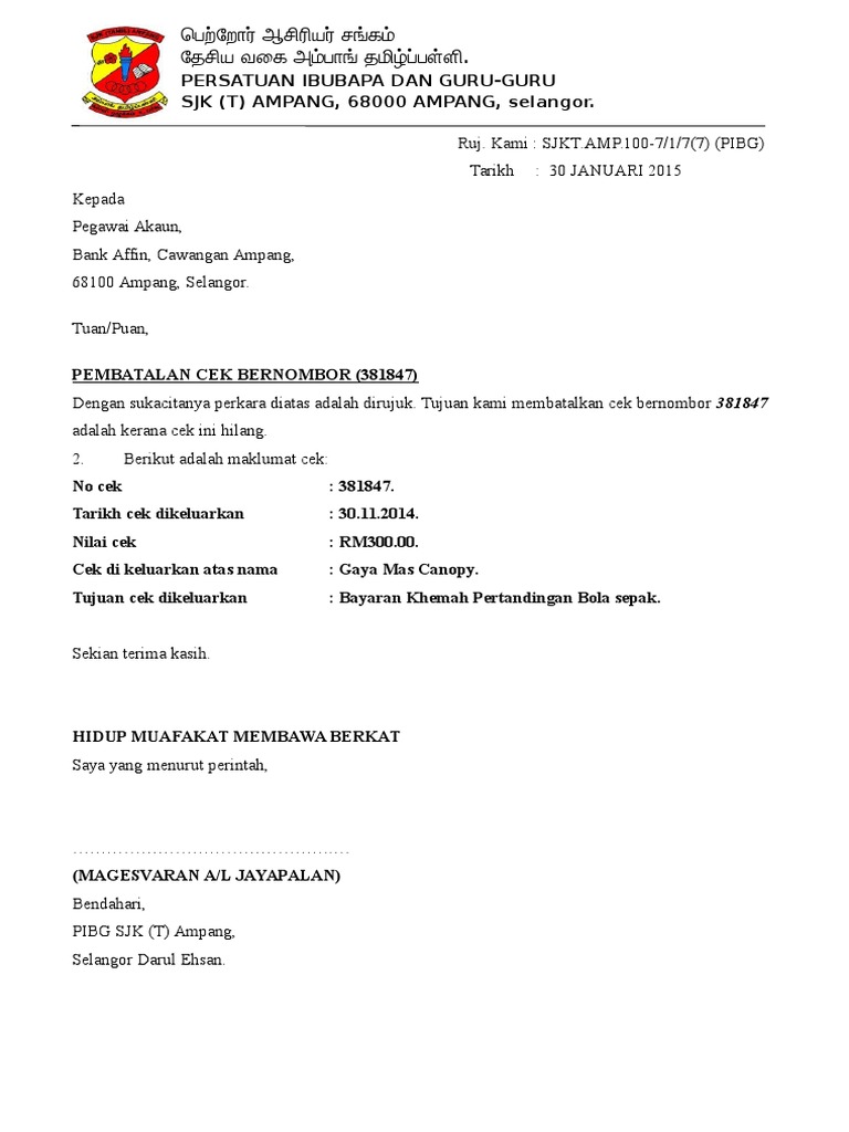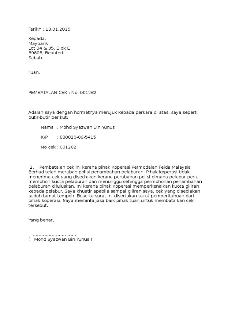 Batal Contoh Surat Pembatalan Cek Kepada Bank