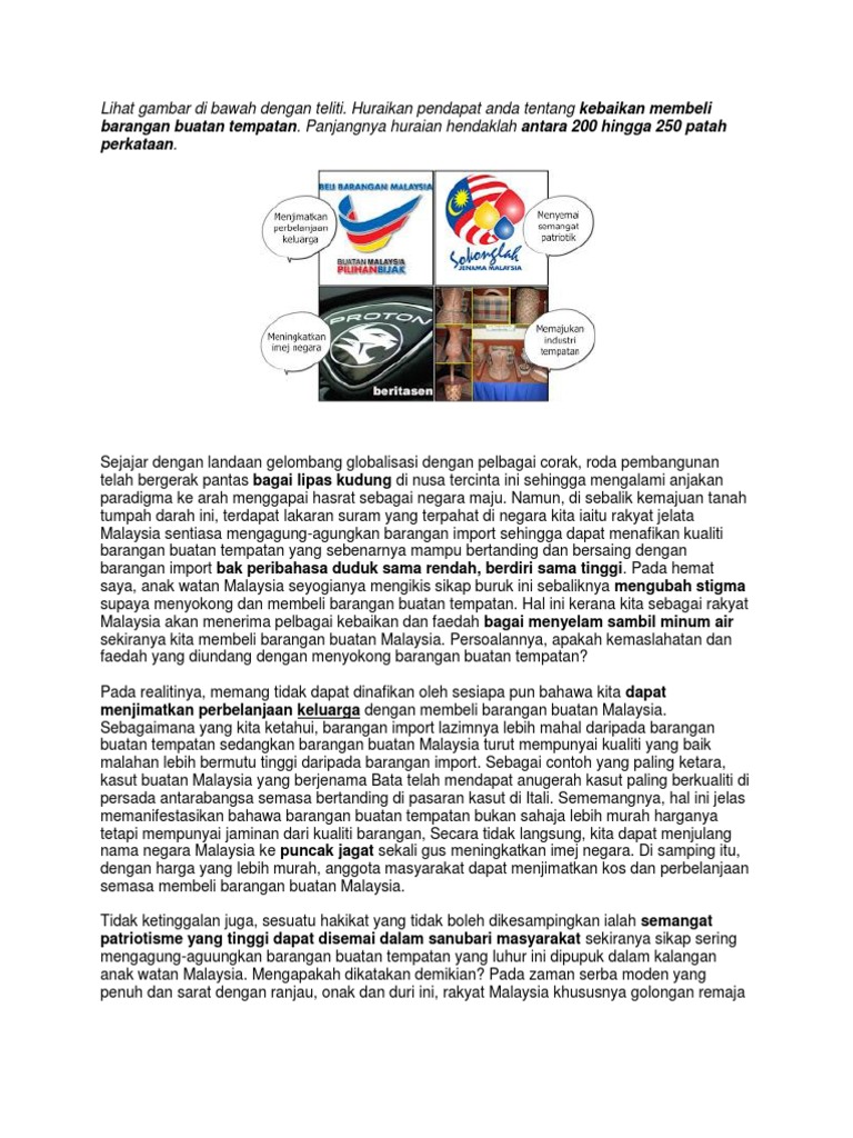 Slogan belilah barang buatan malaysia merupakan slogan yang sering kita dengar sama ada di televisyen atau di radio. Sesungguhnya seperti yang dikatakan oleh bekas perdana menteri malaysia yang keempat tun doktor mahathir mohammad membeli barangan buatan tempatan merupakan teras kejayaan malaysia menggapai lonjakan masa depan dalam bidang industri. Dalam kata lain membentuk rasa cinta pada barangan buatan malaysia. Antara barang buatan malaysia adalah seperti kereta proton saga barangan tembikar batik lukis dan perabot rotan.