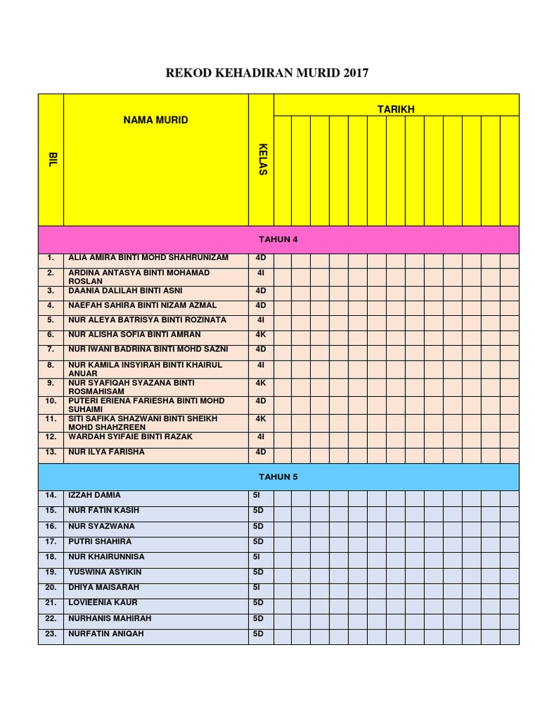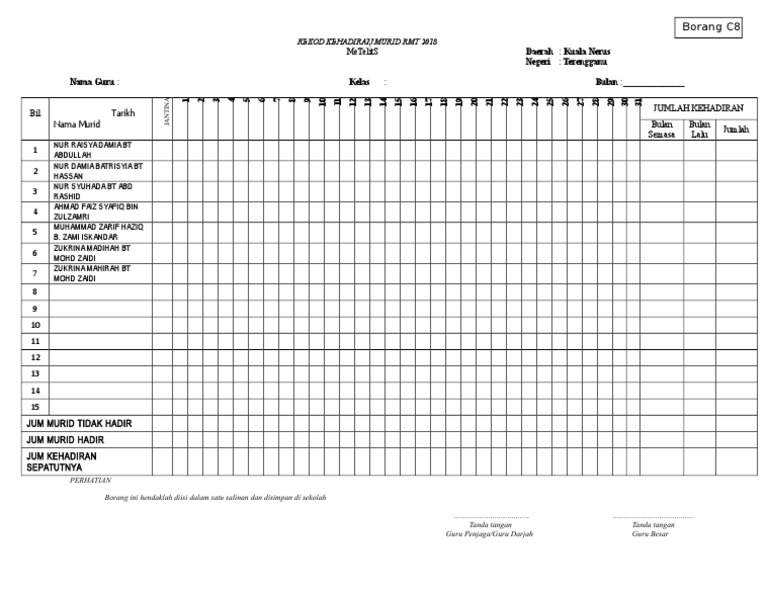Panduan menggunakannya juga telah disediakan. Salah satu elemen yang mendokong kecemerlangan pengurusan hal ehwal murid adalah pengurusan buku jadual kedatangan murid bjkm. Analisa buku asrama bina kuiz carian kes disiplin cetak rekod daftar sesi individu graf kehadiran murid guru telah berhenti jumlah kes jumlah kesalahan disiplin murid. Muat turun template excel buku rekod kehadiran murid 22 55 00 apdm automasi buku kedatangan murid excel buku rekod kedatangan murid merupakan dokumen penting di sekolah guru yang pernah menjadi guru kelas pasti menjaganya dengan teliti dan sentiasa sibuk di awal persekolahan terutamanya untuk mengemaskini maklumat murid.